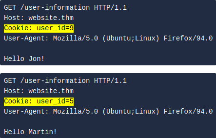 Consider a website that stores sessions cookies like the following, with an incremental number for each user. An attacker can modify the value of the user_id cookie to gain access to other users account or an Administrator account.