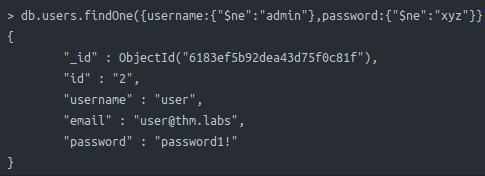 - Instruct MongoDB to find a document that its username is not equal to admin and its password is not equal to xyz, which returns the statement as true.