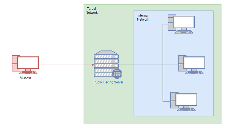 - In this diagram, there are four machines on the target network: one public facing server, with three machines which are not exposed to the internet. By accessing the public server, we can then pivot to attack the remaining three targets.