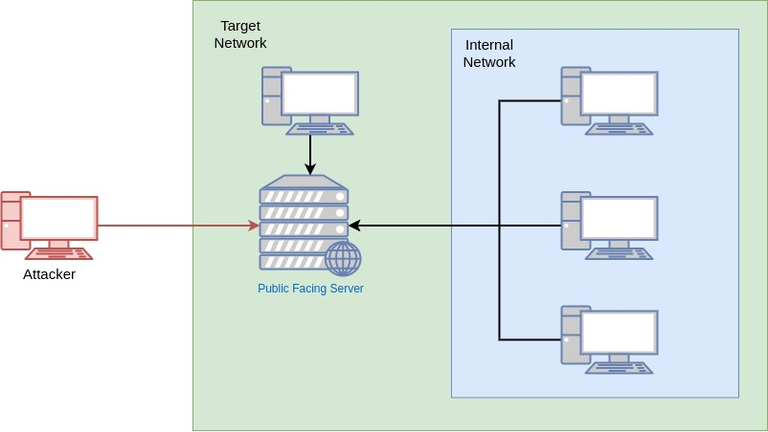 Once a connection is establised on the Public Facing Server that is in the Target Network via a reverse shell, it is possible to access/enumerate or exploit any vulnerabilities against a different target in the same network trough ligolo (such as a DMZ) or a target that is in a neighbouring network (in the case of a non-segmented network). This allows an attcker to use their very own tools from the attacking machine.